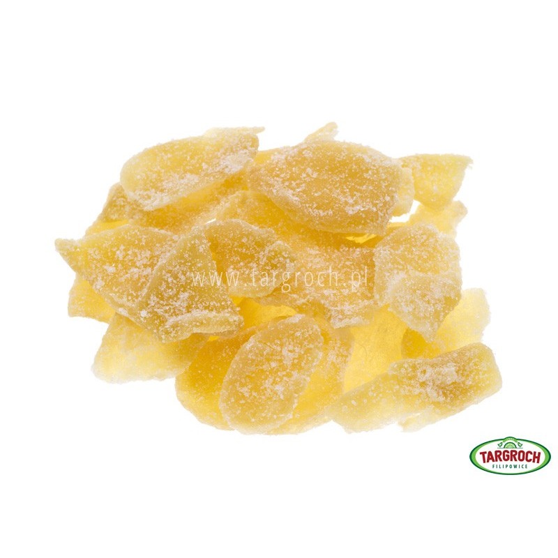 Składniki: Imbir suszony (12,96%), cukier (74,01 %) , kwas cytrynowy (1,2%), substancja konserwująca SO2