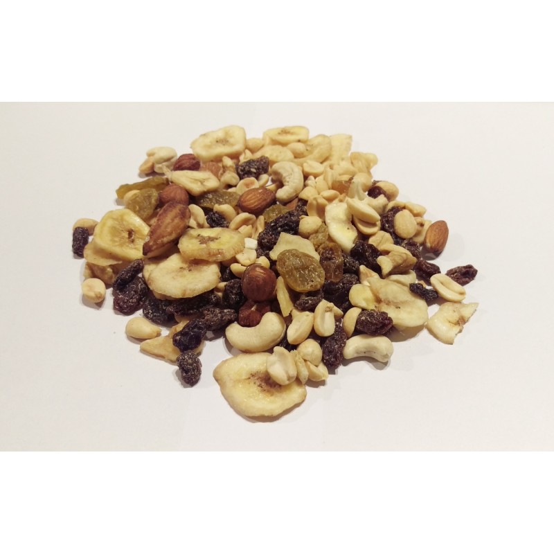 Składniki: rodzynka thompson, orzech brazylijski, orzech włoski, orzech laskowy, migdał blanszowany, chipsy bananowe, orzech nerkowca, migdał, rodzynka, orzech ziemny prażony